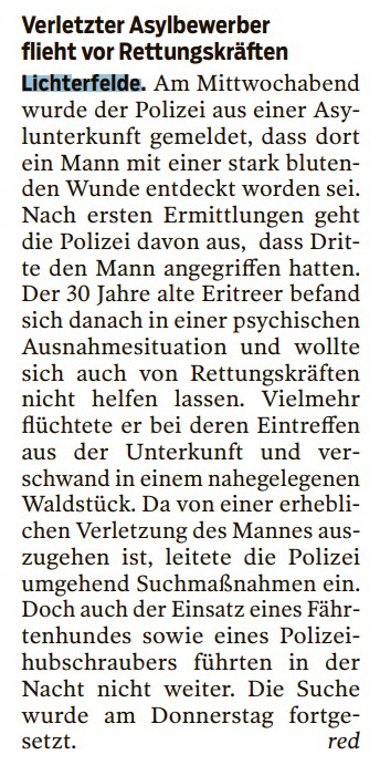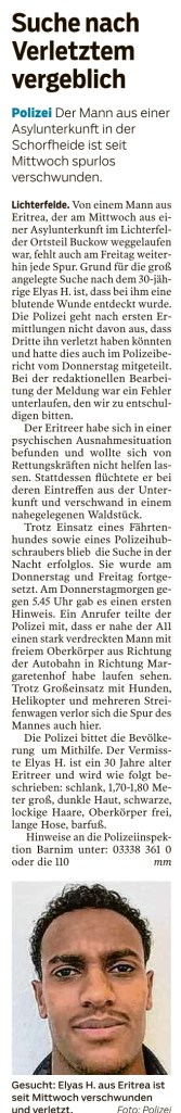 ▓ VERMISSTENSUCHE RUHT Die Suche nach dem 30-jährigen Mann aus Eritrea, der am Mittwoch vergangener Woche verwundet aus einer Asylunterkunft in Buckow bei Lichterfelde wegrannte, ist erfolglos geblieben. Da es mit Stand vom Montag keine Anhaltspunkte für gezielte Suchmaßnahmen gebe, würde die Vermisstensuche nun ruhen, teilte die Pressestelle der Polizeidirektion Ost mit. Der Vermisste, dessen Verletzung ihm wohl nicht durch Dritte zugefügt wurde, war bei Eintreffen der Rettungskräfte aus der Unterkunft geflohen. Trotz Einsatzes von Hunden und Helikopter wurde er nicht gefunden. Hinweise an die Polizei unter: 03338 3610 oder der 110. Dienstag, 7. September 2021 S.17