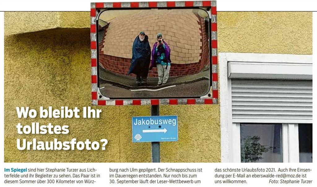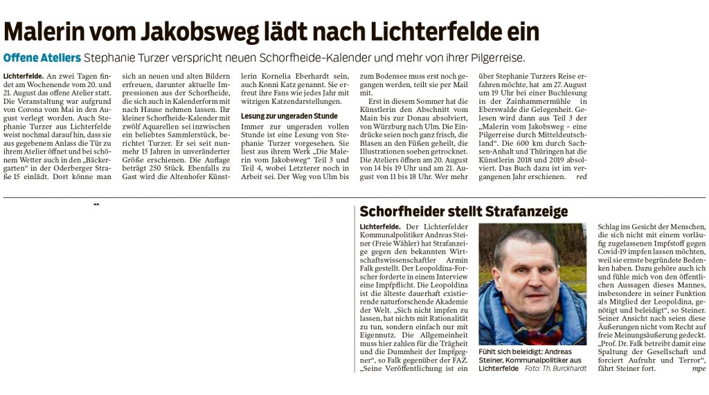 die Vollen. Es liest die Lichterfelderin Künstlerin Stephanie Turzer in der Zainhammermühle aus dem dritten Teil ihres Buches „Die Malerin vom Jakobsweg – eine Pilgerreise durch Mitteldeutschland“. Freitag, 27. August 2021 S.16