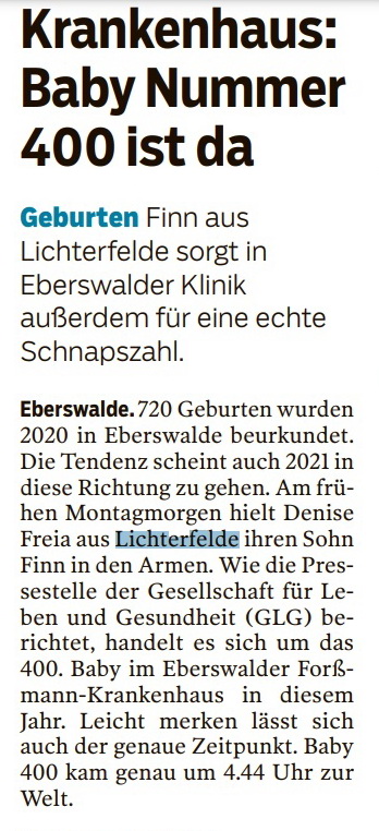 am Sonntag: Eberswalde: Joseph Henschel zum 81., Maria Schuster zum 71., Biesenthal: Wolfgang Frühbrodt zum 77., Finowfurt: Hans de-le-Roi zum 81., Joachismthal: Jürgen Greif zum 81., Lichterfelde: Monika Krebs zum 78., Lunow: Waltraut Ahrens zum 85., Marienwerder: Helga Fährmann zum 75.,Geburtstag. Seite 13 Sonnabend/Sonntag, 27./28. Februar 2021