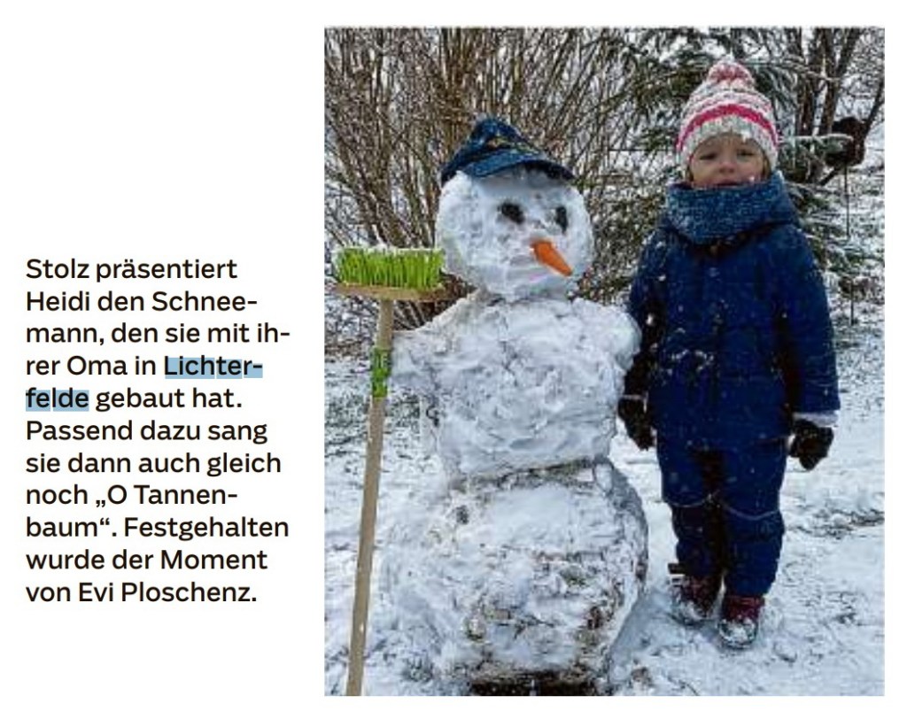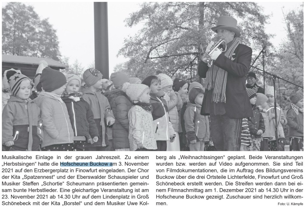14:45 Uhr, Eröffnung mit traditionellem Stollenanschnitt ca. 15:00 Uhr Eintreffen des Weihnachtsmanns mit der Kutsche, anschließend Auftritt der Kinder der Kita „Kleiner Strolch“ Lichterfelde, Kinderprogramm „Mit Clown Nanü im Winterwald“, weihnachtliche Klänge mit dem Gemischten Chor Finowfurt, außerdem: Ponyreiten, Süßwaren u.v.m. 17.11.2021 S.12 Kurier