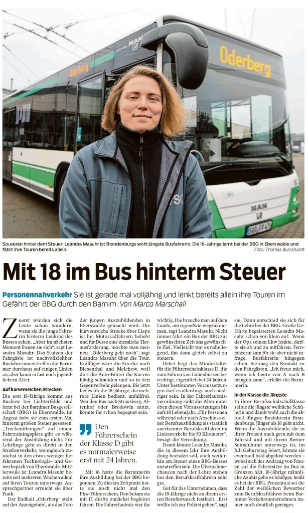 ▓ Bei der Barnimer Busgesellscha (BBG) arbeitet Brandenburgs wohl jüngste Busfahrerin. Die 18-jährige Leandra Masuhr aus Buckow bei Lichterfelde ist im Januar 2021 noch 18 Jahre jung. Zu jenem Zeitpunkt ist sie Auszubildende bei der BBG, soll aber noch im selben Jahr ihren Abschluss machen. Schon als Azubine lenkt sie die großen Geährte auf ihren Touren völlig selbstständig durch den Landkreis