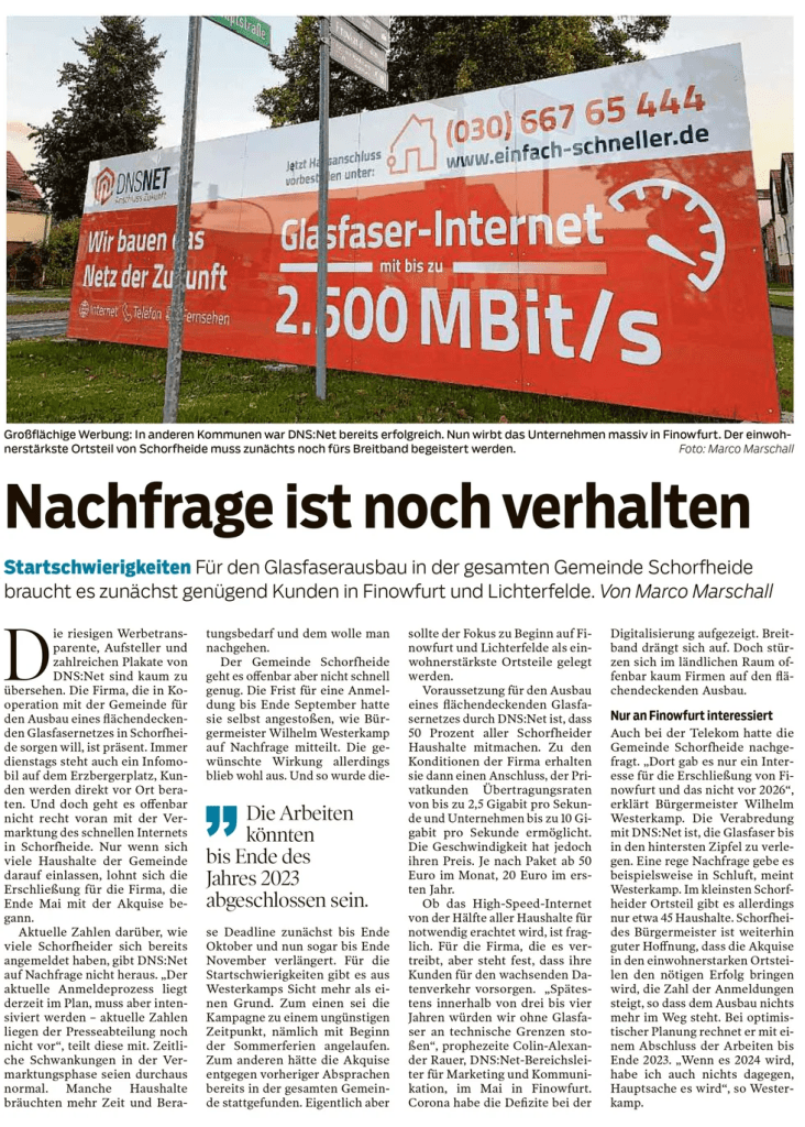 Verhaltene Nachfrage nach High-Speed-Internet Schorfheide. Für den Glasfaserausbau